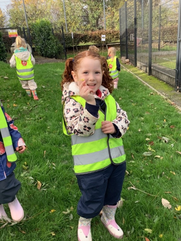 We all loved our first Forest School day! We walked around the grounds observing the leaves changing colour and saw some falling to the ground. To stay safe, we learned about our whistle rules and boundary flags. Through exploring the are we found leaves of different shapes, sizes and colours; sticks which were thick, thin, straight and curved; seeds such as pine cones, acorns and helicopter seeds. We even found a daisy and a buttercup. We really enjoyed singing round a campfire and toasting our snack.